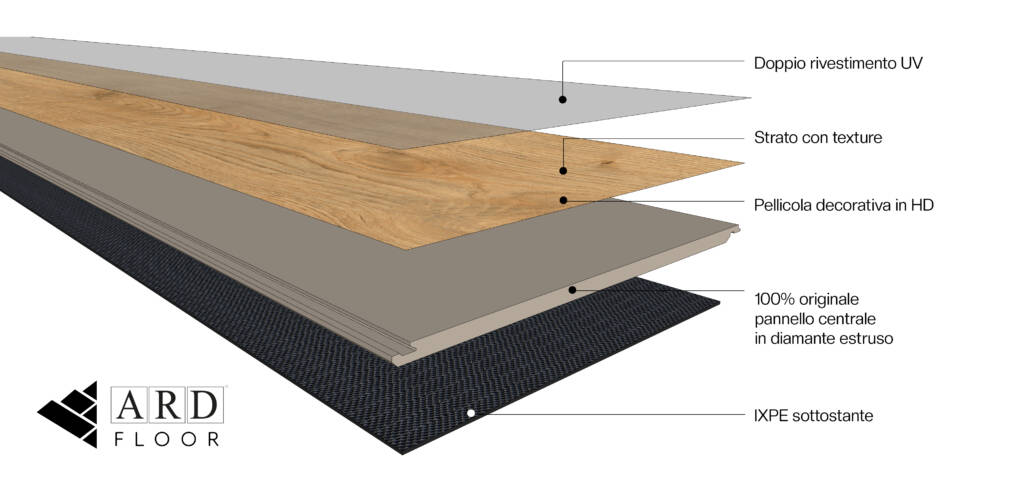 L’ SPC è un nuovo materiale per pavimentazione, avanzato perché impermeabile, rigido e dimensionalmente stabile. Come materiale del nucleo estruso, il nucleo SPC è un materiale composito costituito da carbonato di calcio, cloruro di polivinile e stabilizzante. Lo strato di usura e le pellicole decorative HD vengono pressati sul nucleo SPC dopo l’estrusione. Il sottofondo IXPE che aderisce sul retro è una buona scelta per un utilizzo di fascia alta. E.I.R. La superficie e le scanalature a V smussate conferiscono la vera sensazione del legno ai pavimenti SPC.